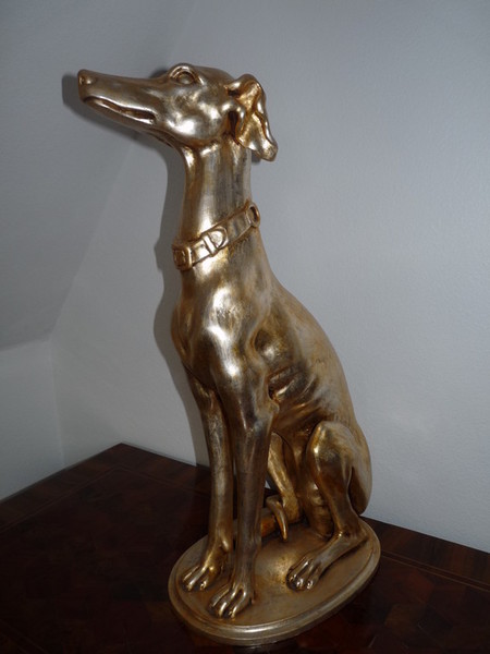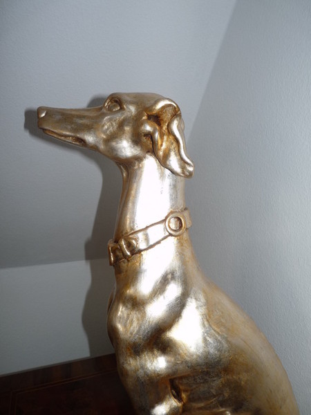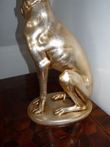Chien Lévrier assis en bois argenté et doré déco du 20ème