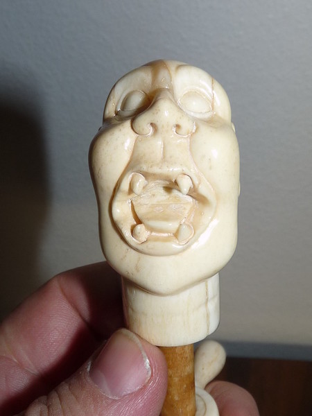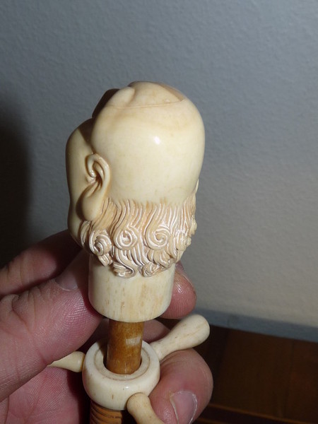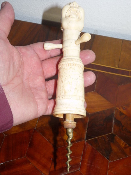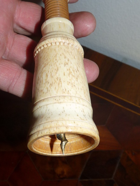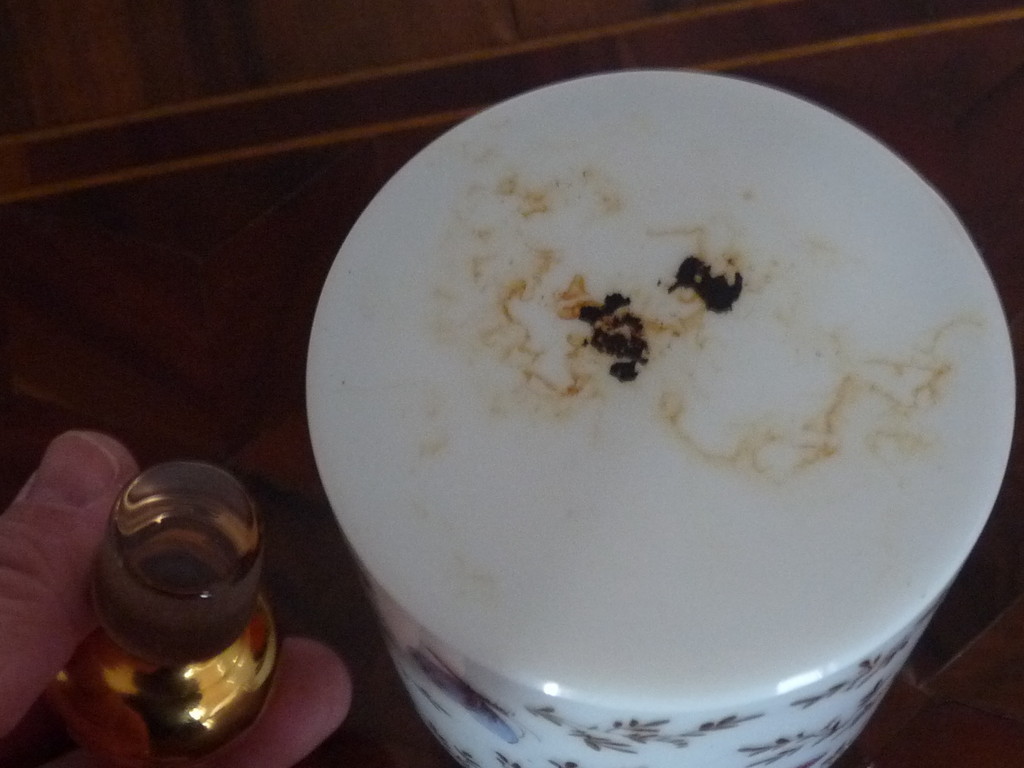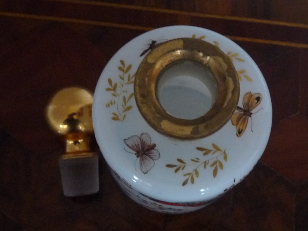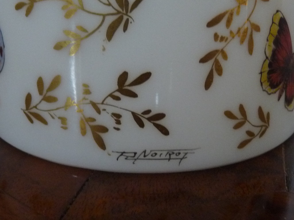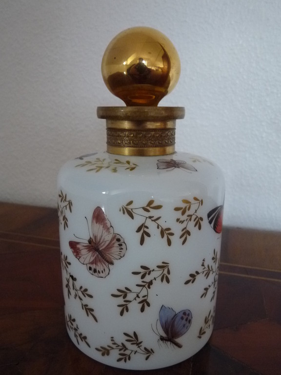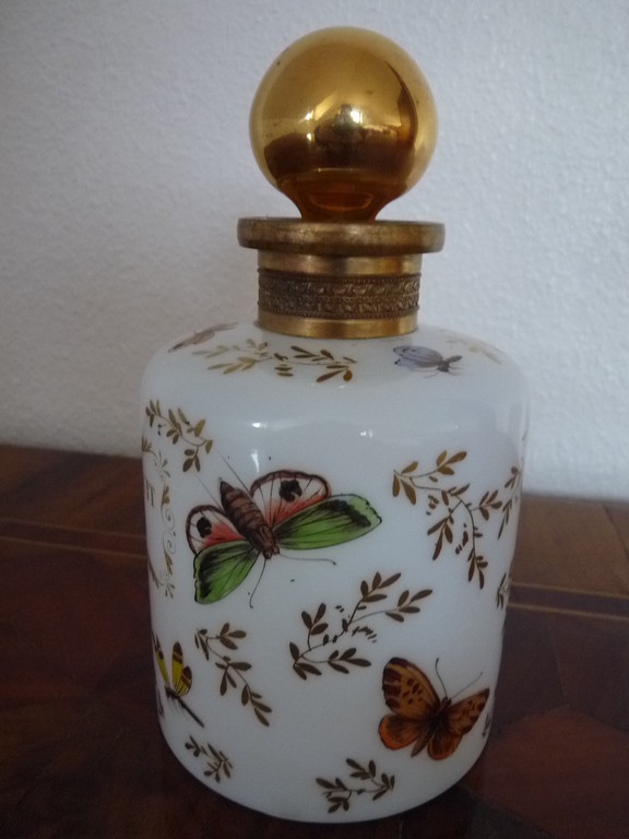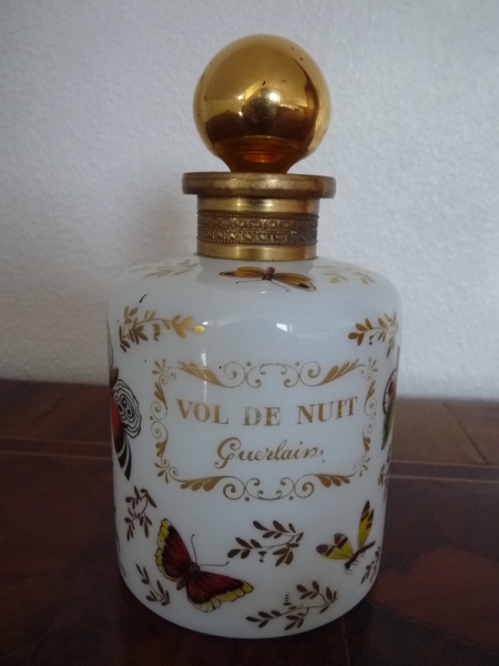 «Vol de nuit» - Luxueux flacon édité par la maison Cristal & Bronze en 1955 en cristal opalin blanc pressé moulé de section et forme cylindriques, entièrement décoré à la main de feuillages et papillons polychromes signés R.Noirot, col bagué de bronze ciselé, son imposant bouchon perle laqué or, titré sur cartouche. Numéroté. h: 17 cm.